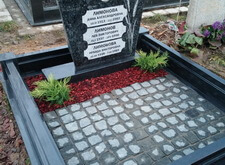 Подход был выбран комплексный. Мы сделали гранитный цоколь, заменили подставку (в будущем на левую свободную часть будет установлена ваза), уложили гранитную брусчатку на пол, оставили зону под будущие посадки цветов, посадили молодой можжевельник, закрыли землю мульчей, чтобы во время дождя земля не поднималась на гранит. И конечно, самое главное – мы сохранили гранитную плиту. Мы снимали ее, полировали лицо на станке и заново наносили надписи и изображение колосьев, обязательное требование заказчика. Мы также заменили фотокерамики на новые и долговечные. Работы была принята клиентом с воодушевлением.