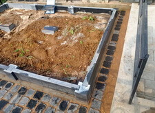 Укрываем внутреннюю зону участка геотекстилем и приносим три массивные прямоугольные плиты, которые в дальнейшем послужат наземным покрытием могилы.