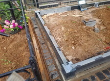 Подготавливаем территорию вокруг места захоронения к покрытию брусчаткой: ввариваем металлическую полосу и укрываем землю геотекстилем.